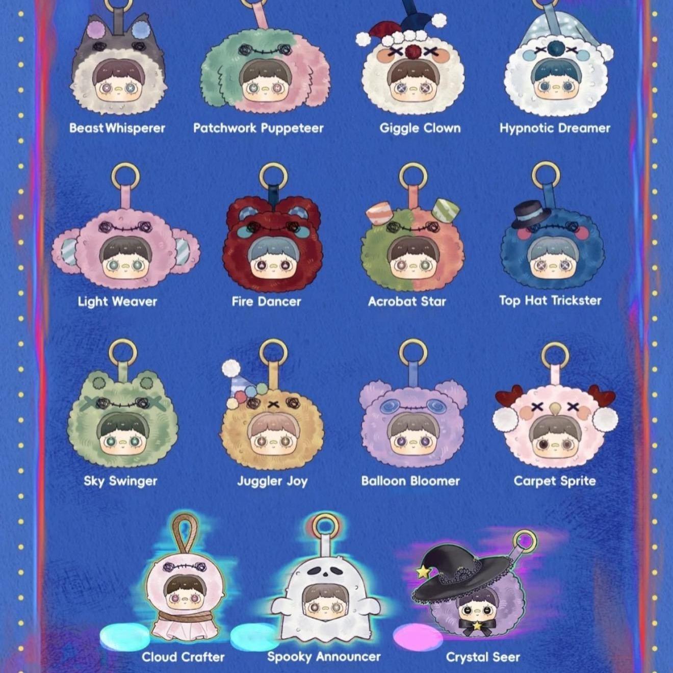 - Charming Circus Theme: Each plush toy is inspired by a fun and colorful circus character. Characters include: Beast Whisperer Patchwork Puppeteer Giggle Clown Hypnotic Dreamer Light Weaver Fire Dancer Acrobat Star Top Hat Trickster Sky Swinger Juggler Joy Balloon Bloomer Carpet Sprite Cloud Crafter (Hidden) Spooky Announcer (Hidden) Crystal Seer (Large Hidden)